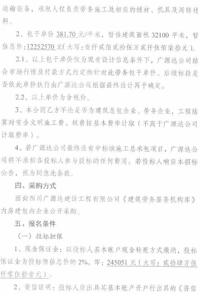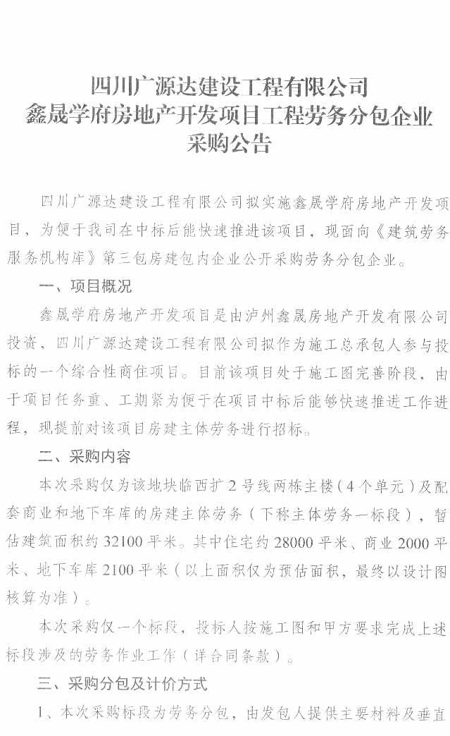 采購公告:四川廣源達建設工程有限公司鑫晟學(xué)府房地產(chǎn)開(kāi)發(fā)項目工程勞務(wù)分包企業(yè)采購公告