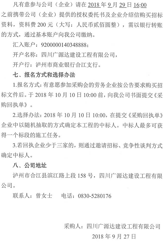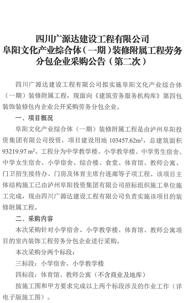 采購公告:四川廣源達建設工程有限公司阜陽(yáng)文化產(chǎn)業(yè)綜合體(一期)裝修附屬工程勞務(wù)分包企業(yè)采購公告(第二次)