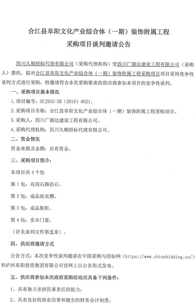 合江縣阜陽(yáng)文化產(chǎn)業(yè)綜合體(一期)裝飾附屬工程采購項目談判邀請公告.doc