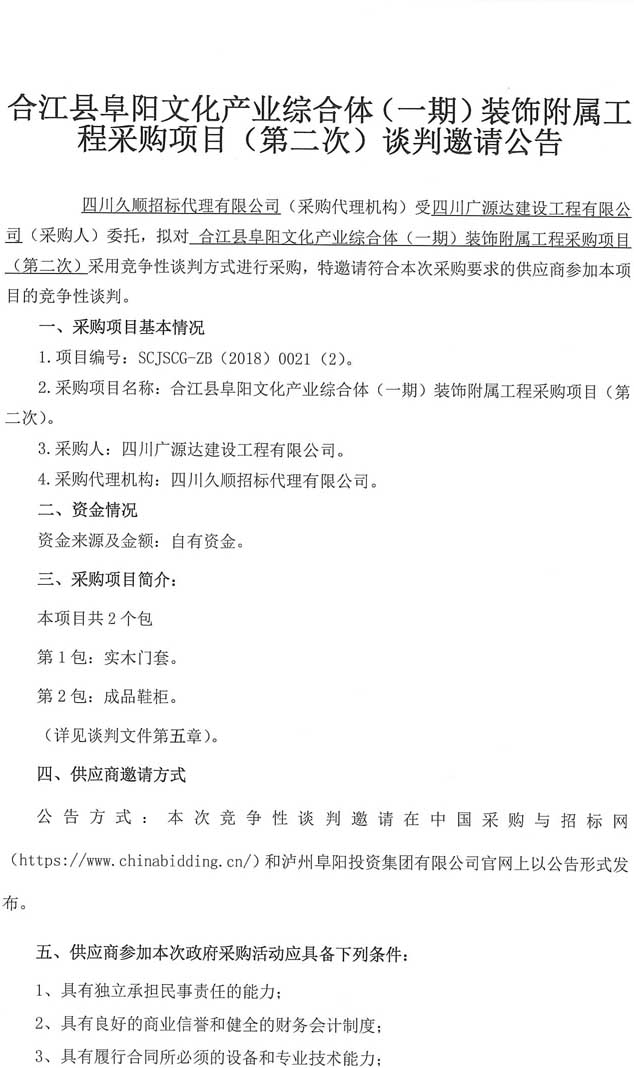 合江縣阜陽(yáng)文化產(chǎn)業(yè)綜合體(一期)裝飾附屬工程采購項目(第二次)談判邀請公告.docx