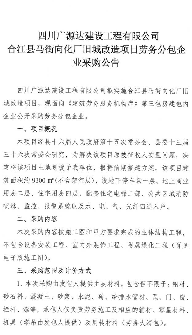 四川廣源達建設工程有限公司 合江縣馬街向化廠(chǎng)舊城改造項目勞務(wù)分包企業(yè)采購公告.doc