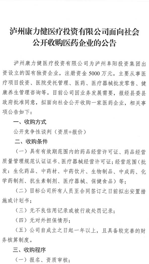 瀘州康力健醫療投資有限公司面向社會(huì )公開(kāi)收購醫藥企業(yè)的公告.doc
