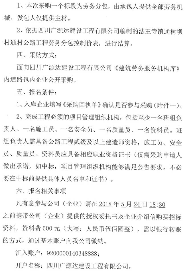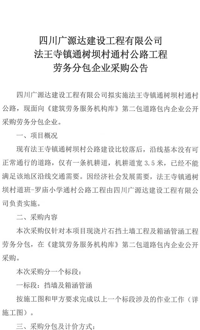 四川廣源達建設工程有限公司法王寺鎮通樹(shù)壩村通村公路工程勞務(wù)分包企業(yè)采購公告.doc