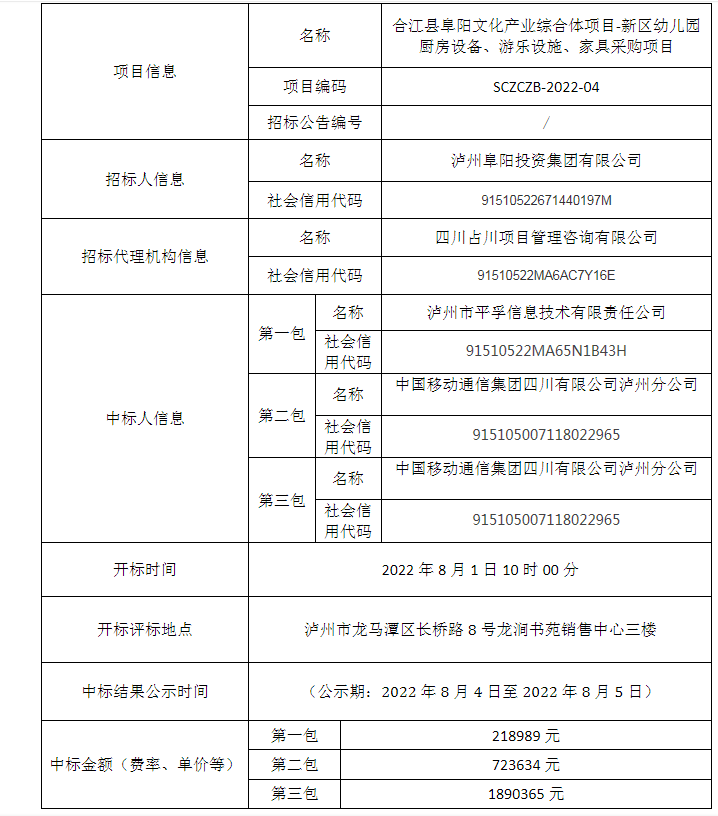 合江縣阜陽(yáng)文化產(chǎn)業(yè)綜合體項目-新區幼兒園廚房設備、游樂(lè )設施、家具采購項目公開(kāi)招標中標結果公告