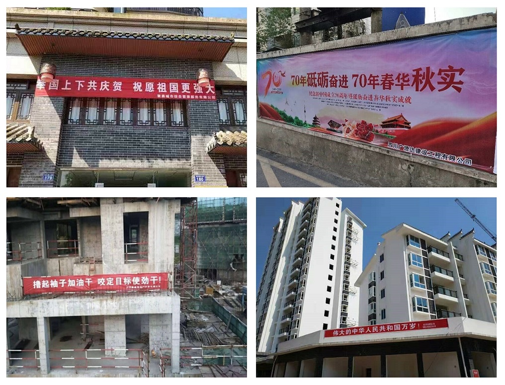為慶祝新中國成立70周年,城投公司、廣源達公司、鑫晟公司于近日在公司項目部、售樓部等地懸掛慶祝標語(yǔ),激發(fā)群眾愛(ài)國熱情,營(yíng)造良好國慶氛圍!